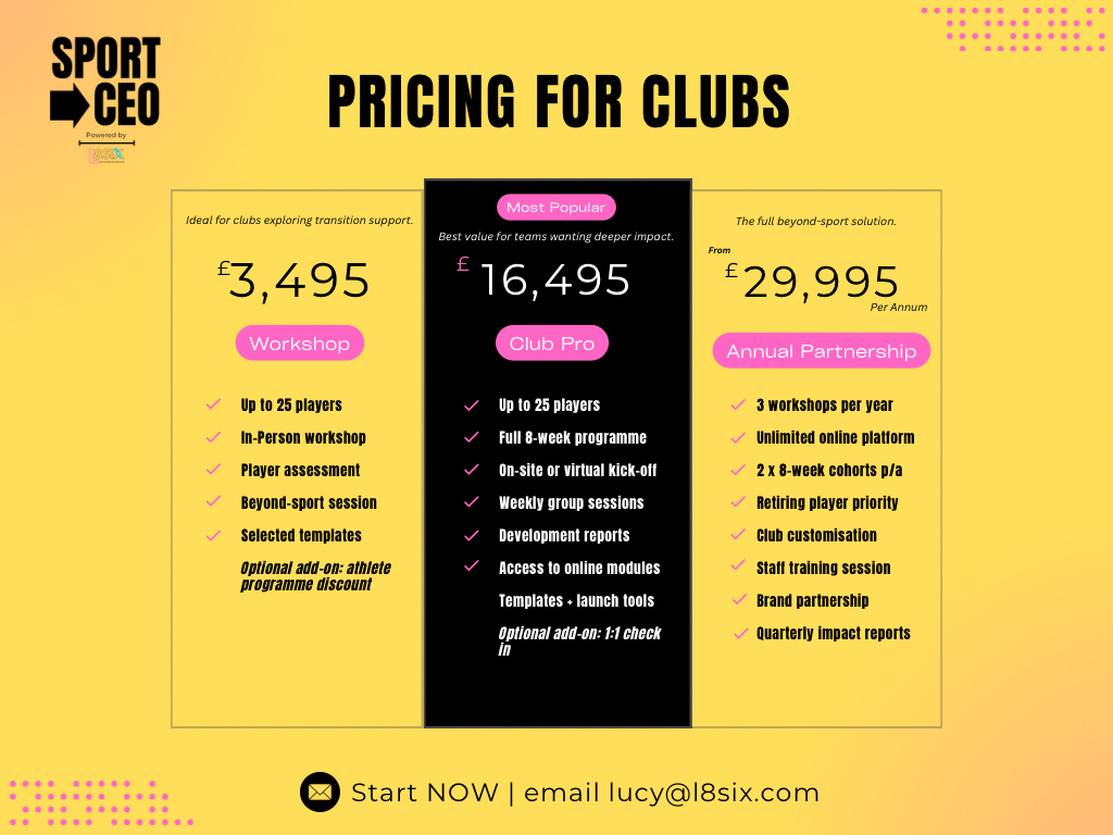 Whether you’re transitioning out of the professional game, recently released, or preparing for “what’s next,” Sport → CEO helps you rebuild identity, confidence and clarity.